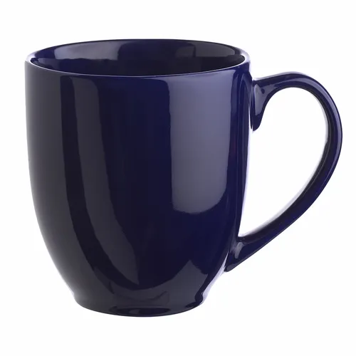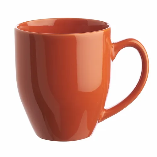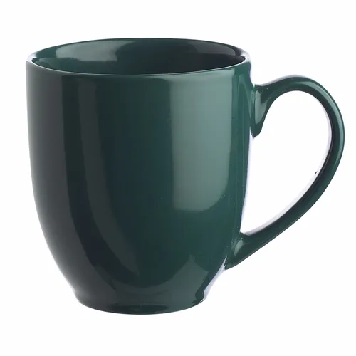 Bistro Style Wide Body Drink Promotional Imprinted Coffee Mugs. Smooth Molded Ceramic Composite. Glossy Vibrant Color Exterior Finish. High-Curved Grip for Easy Grab-n-Go Handling. Recommended Hand Wash Only