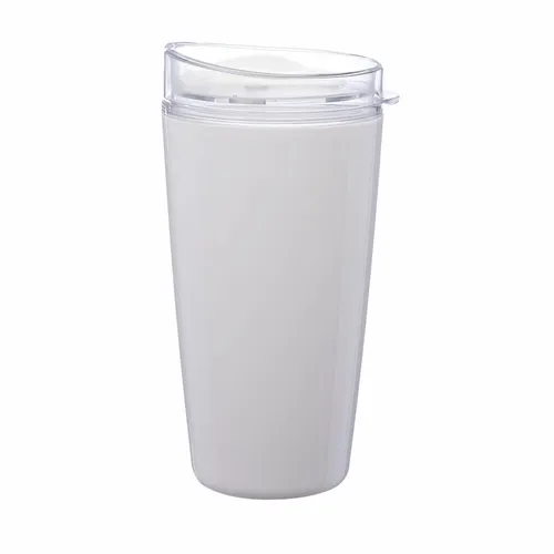 Tritan Material. Double Wall Construction for Insulation of Hot or Cold Liquids. Snap-On, Spill-Resistant, 2-Piece Thumb-Slide Lid. BPA Free. Made in the USA