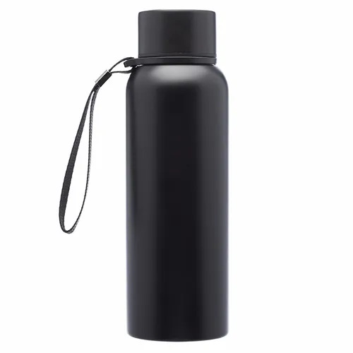 Double Wall Stainless Steel Vacuum Water Bottle. Plastic Lid with Stainless Steel Wrap. With Carrying Strap