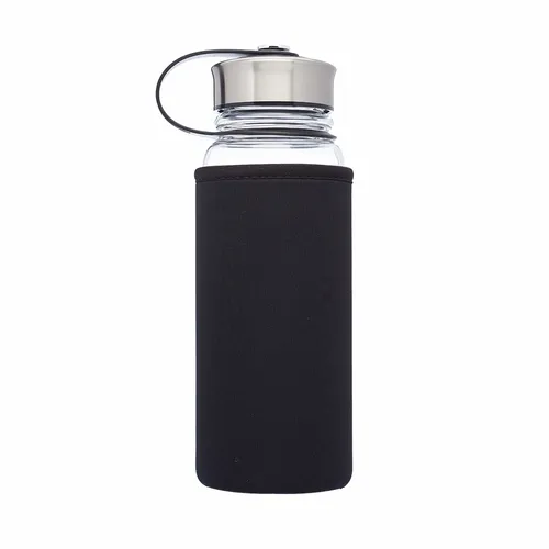 Clear Glass Water Bottles. Black Plastic Lid with Stainless Steel Wrap. Plastic Handle Connected to Lid. Neoprene Pouch. Holds 25 oz of Liquids. Recommended Hand Wash Only