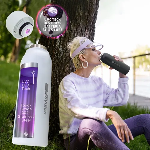 An insulated bottle that purifies your drink and interior surface with just a touch of a button. Using UV-C LED light disinfection technology eliminates 99.99% of harmful bacteria and odors. Made with food-grade 304-stainless steel, and double-wall insulation construction keeps your beverages cold for 24 hours or hot for 12 hours. Its convenient "self-cleaning mode" automatically operates every 6 hours when active and helps keep the bottle germ and odor-free. Large 20 oz. capacity.