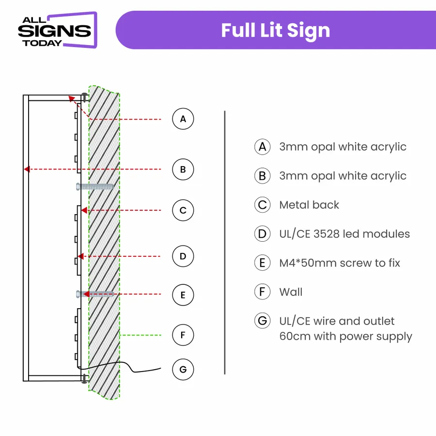 Crafted with meticulous attention to detail, our Full-lit Letter Sign features high-quality materials that ensure durability and longevity. Each letter is fully illuminated with vibrant LED lights, creating a stunning and radiant display that demands attention.