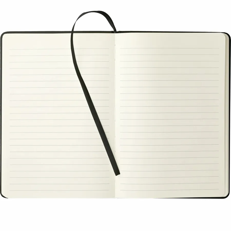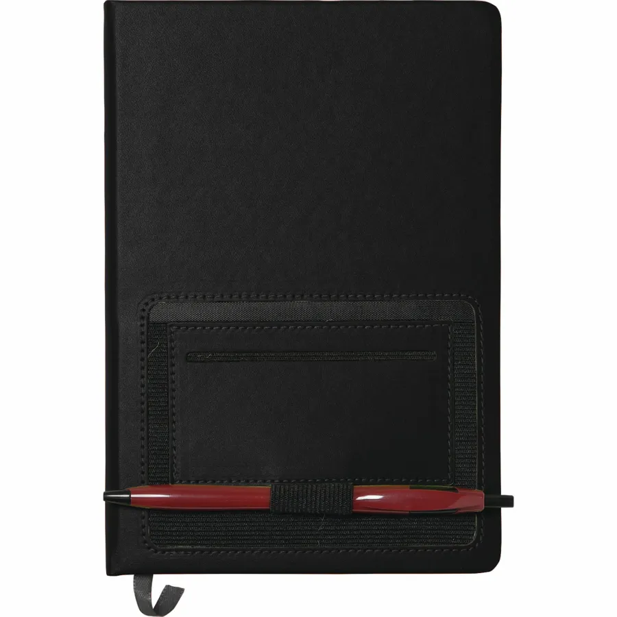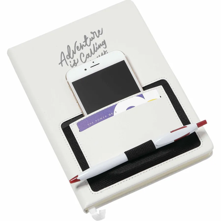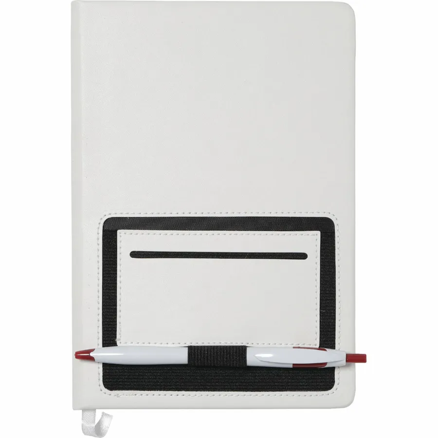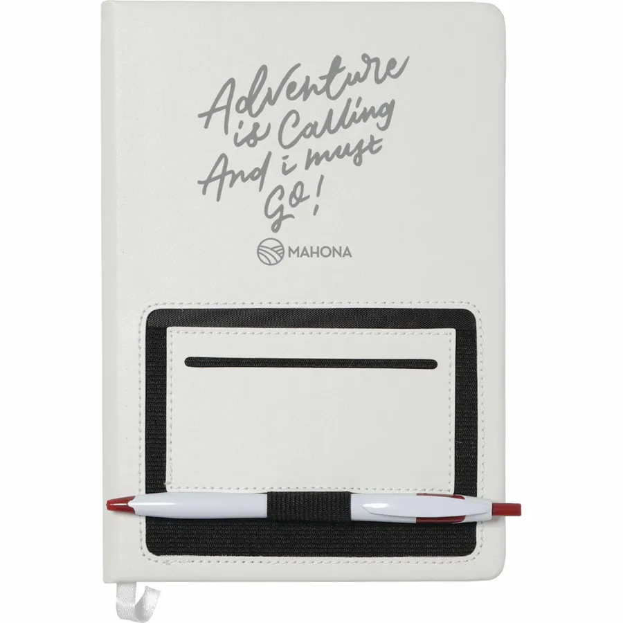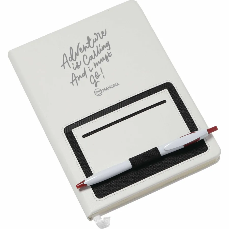 The 6 x 8 FSC Mix Moda Notebook is an eye-catching, PU, hardbound journal with 80 sheets of cream lined FSC Mix paper inside. It includes a color matching ribbon page marker and a front pocket that can hold a smartphone and has a business card slot. The Moda Notebook also has an elastic pen loop.