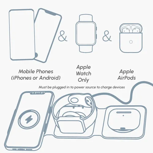 A travel kit for busy business teams that travel and need to keep multiple devices charged. It comes with our new Chi-Charge Stack(#2176, exclusively patented) that wirelessly charges a phone, Apple Watch, and AirPods, plus a USB-C and USB-A AC adapter(#2181) that comes with a Type-C power cord. Simply plug into a reliable power source and charge all three devices. Left Charging Pad: Apple or Android phones/Middle Charging Pad: Apple watch only/Right Charging Pad: Airpods or another phone.